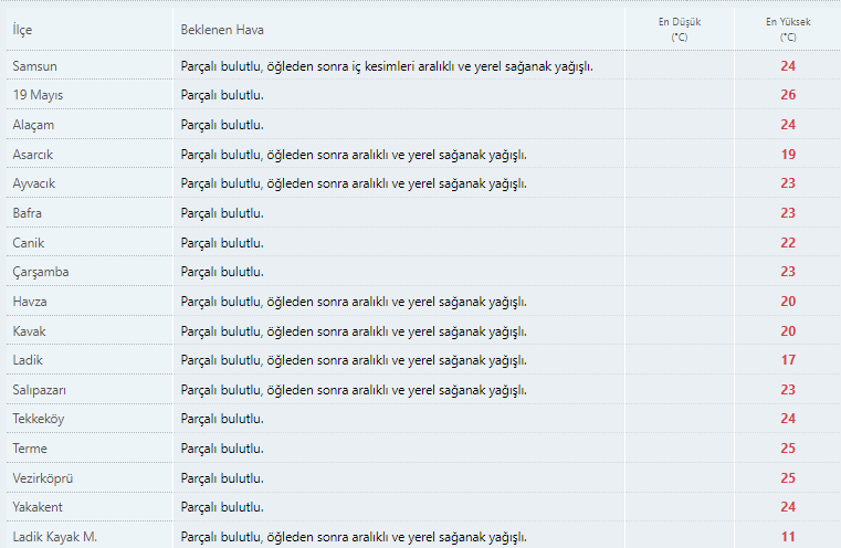 Bölge genelinde havanın parçalı ve yer yer çok bulutlu; öğle saatlerinden sonra Samsun ve Ordu'nun iç kesimlerinin aralıklı ve yerel olmak üzere sağanak yağışlı geçeceği tahmin ediliyor.