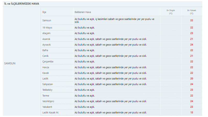 SAMSUN MERKEZ VE İLÇELERDE HAVA DURUMU