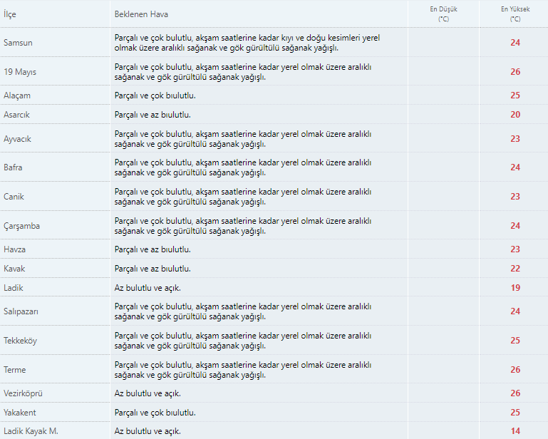 Yapılan son değerlendirmelere göre; Bölge genelinin az bulutlu, kuzey doğu kesimlerin parçalı ve yer yer çok bulutlu, Samsun'un kıyı ve doğusu ile Ordu çevrelerinin akşam saatlerine kadar yerel olmak üzere aralıklı sağanak ve gök gürültülü sağanak yağışlı geçeceği tahmin edilmektedir.