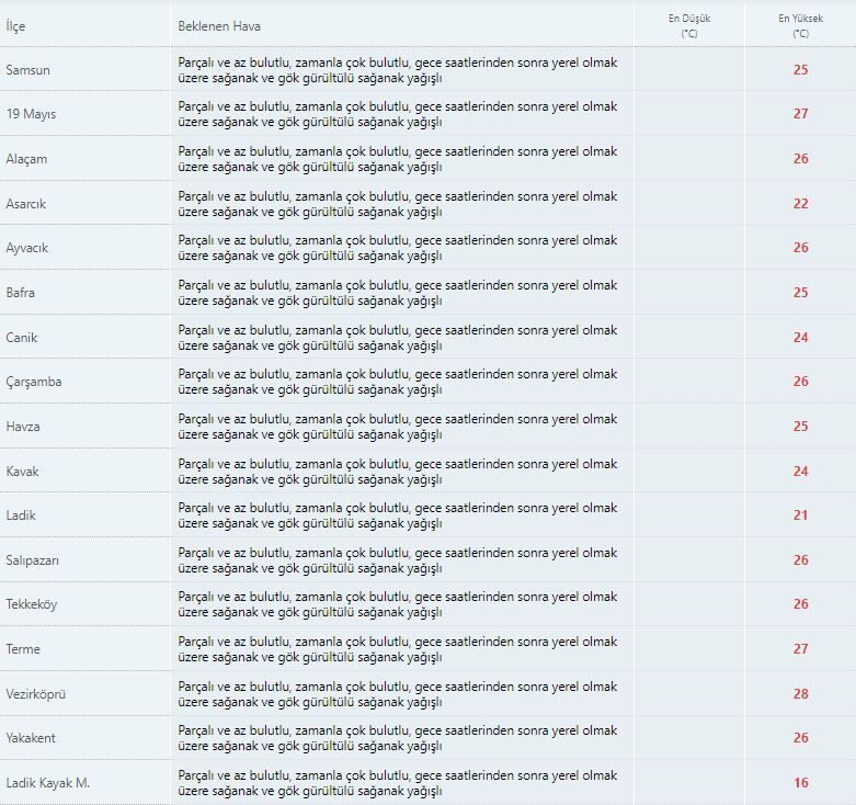 Bölge genelinde havanın parçalı ve çok bulutlu, Samsun ve Ordu çevreleri yerel olmak üzere sağanak ve gök gürültülü sağanak yağışlı geçeceği tahmin ediliyor.