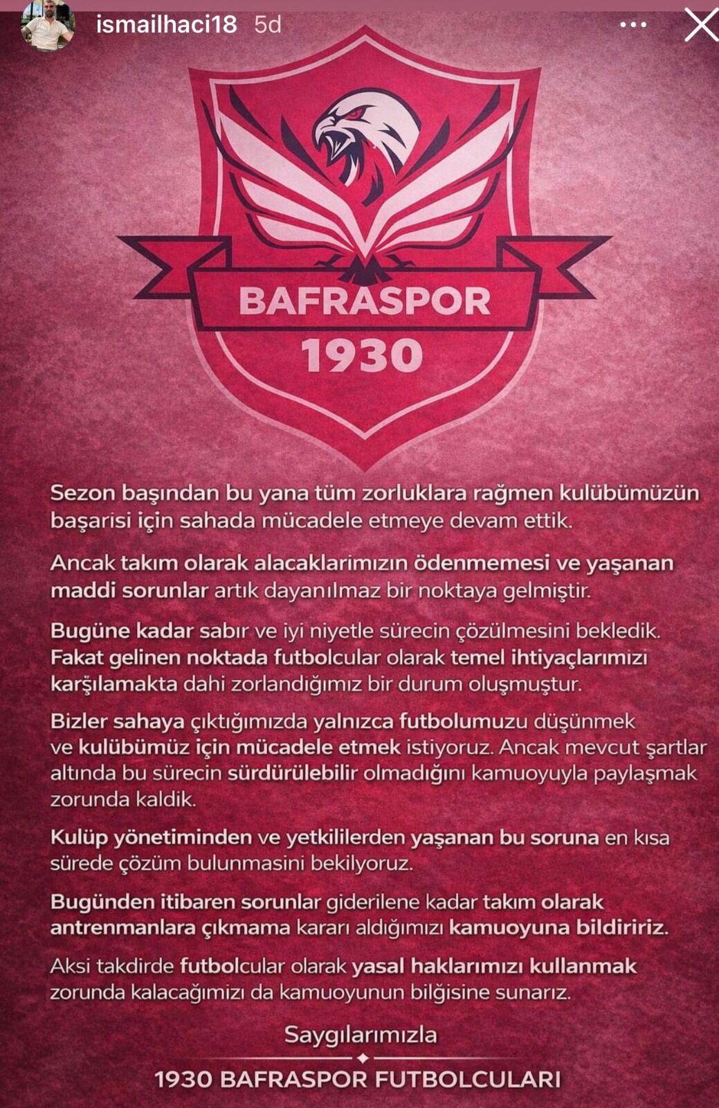 Takım kaptanı İsmail Hacıismailoğlu sosyal medya hesabından yaptığı açıklamada, “Sezon başından bu yana tüm zorluklara rağmen kulübümüzün başarısı için sahada mücadele ettik. Ancak alacaklarımızın ödenmemesi ve yaşanan maddi sorunlar dayanılmaz bir noktaya gelmiştir. Bugünden itibaren sorunlar giderilene kadar takım olarak antrenmanlara çıkmama kararı aldığımızı kamuoyuna bildiririz. Aksi takdirde yasal haklarımızı kullanmak zorunda kalacağız” ifadelerini kullandı. Kulüp içindeki bu gelişmeler, yönetim ve futbolcular arasında çözüm bekleyen ciddi bir kriz olarak öne çıkıyor. Taraftarlar ve spor kamuoyu, yaşanan sorunun kısa sürede çözüme kavuşturulmasını bekliyor
