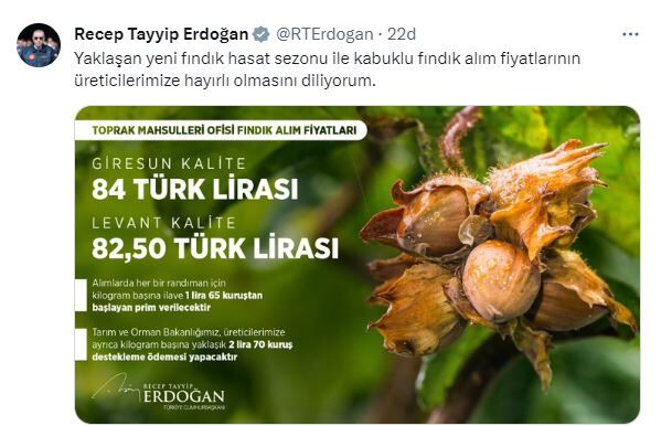 Her yıl genellikle temmuz ayının sonu ve ağustos ayının başı itibarıyla belli olan fındık fiyatları için beklenen açıklama geldi. 7 Ağustos'ta yapılan Kabine Toplantısı sonrası Cumhurbaşkanı Recep Tayip Eroğan fındık taban fiyatları ile ilgili, "Giresun kalite için kilo başına 84 lira, levant kalite için kilo başına 82,50 lira olarak belirlenmiştir" diye konuştu.