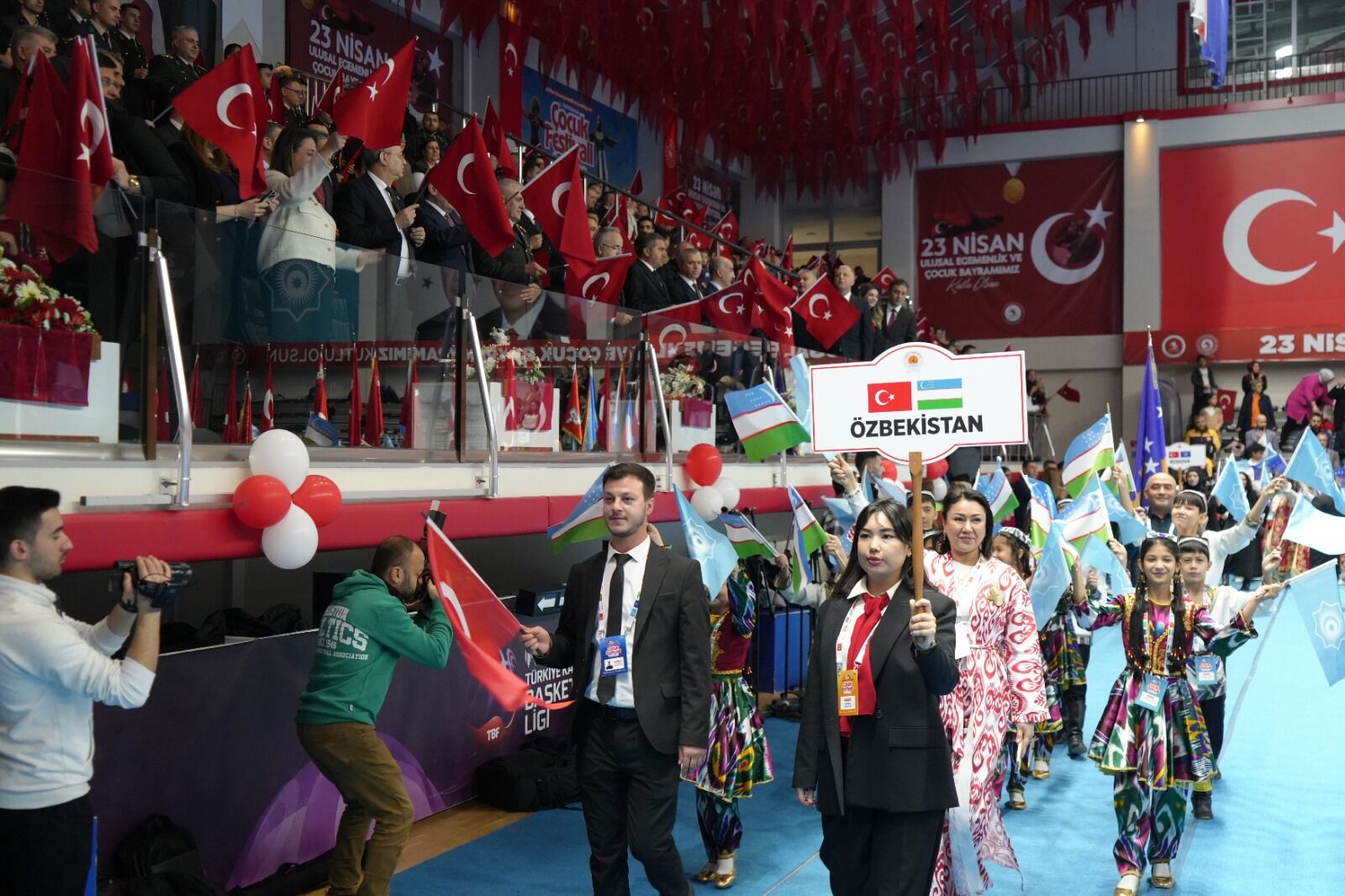 Onur Anıtı’ndaki törenin ardından kutlamaların ana bölümü Mustafa Dağıstanlı Spor Salonu’nda devam etti. Salondaki program, askeri bandonun seslendirdiği “Bir Başkadır Benim Memleketim” ve “En Büyük Bayram Bu Bayram” çocuk şarkıları eşliğinde düzenlenen geçit töreniyle başladı. Saygı duruşu ve İstiklal Marşı’nın okunmasının ardından Milli Eğitim Bakanı Prof. Dr. Yusuf Tekin’in 23 Nisan’ın anlam ve önemine ilişkin mesajı katılımcılarla paylaşıldı.