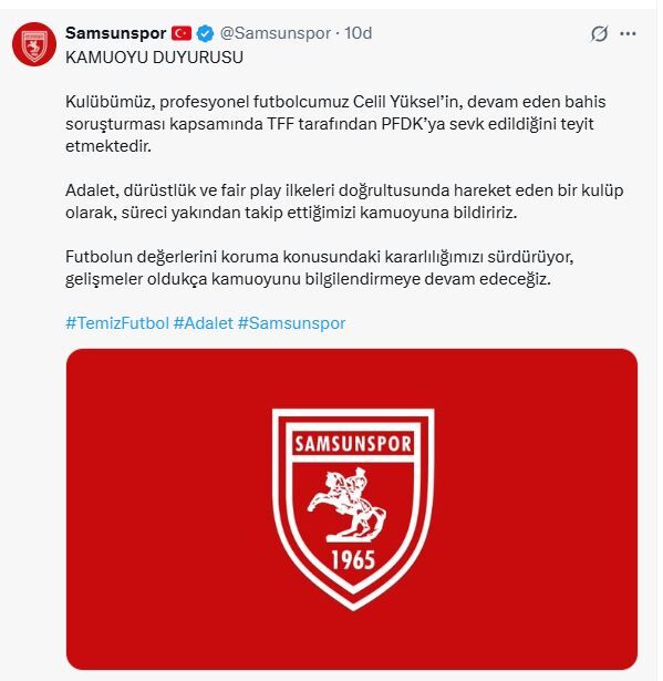 TFF tarafından yürütülen bahis soruşturması kapsamında Samsunspor'dan Celil Yüksel’in de tedbirli olarak PFDK’ya sevk edildiği açıklanmıştı. Kırmızı-Beyazlı futbolcunun ardından kulüp, yaşanan olayla ilgili sosyal medya hesabından yazılı bir açıklama yaptı.