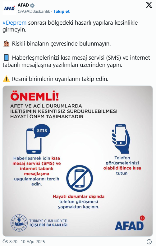 “Deprem sonrası bölgedeki hasarlı yapılara kesinlikle girmeyin” uyarısı yapan AFAD “Riskli binaların çevresinde bulunmayın, haberleşmelerinizi kısa mesaj servisi (SMS) ve internet tabanlı mesajlaşma yazılımları üzerinden yapın” diyerek seslendi.