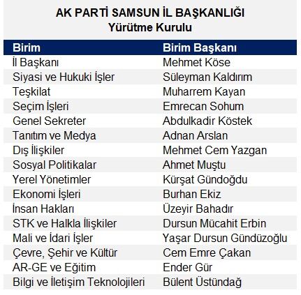 Kongrede, AK Parti Samsun İl Başkanlığı'nda görev dağılımı da netleşti. Yeni yönetim, partinin yerel teşkilatlarını daha güçlü bir şekilde yönetmek amacıyla belirli alanlarda görev dağılımı yaptı. İşte AK Parti Samsun İl Başkanlığı’nda yeni görev alan isimler: