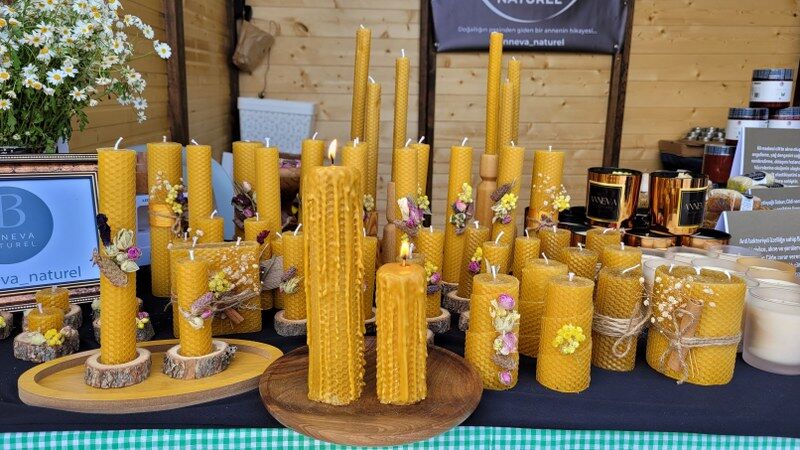 Balmumunun doğallığını ve çok yönlülüğünü keşfettikten sonra sadece krem değil, özel tasarım mumlar da üretmeye başladığını anlatan Kanca, "Arıların peteklerinde balmumu kullandığını görünce petekleri sarıp içine fitil koyarsam mum olur mu diye düşündüm. Balmumu mumlar ortamı temizliyor, nefesi açıyor, enerjiyi yükseltiyor. Ben de hem klasik modeller hem de müşterilerimin özel eşyalarına döküm yapılan tasarımlar üretiyorum." diye konuştu.