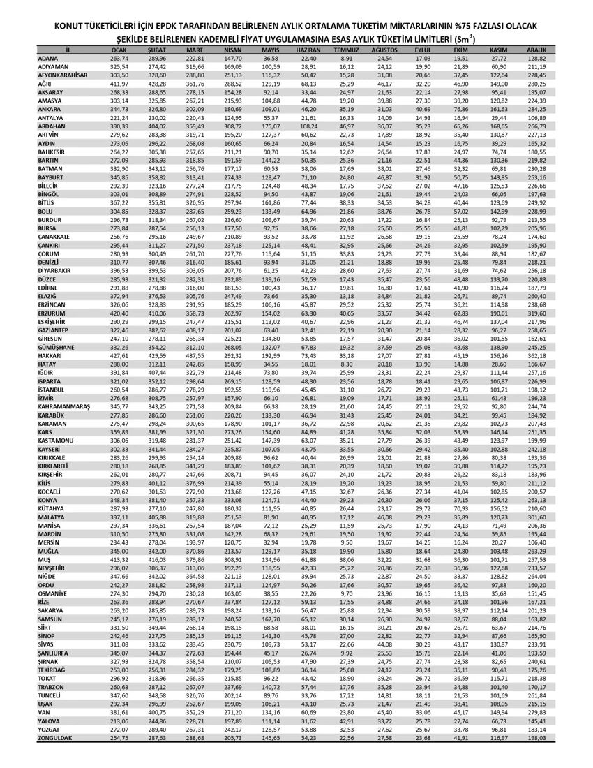 Açıklanan tabloya göre Samsun’da aylık tüketim limitleri şu şekilde belirlendi: