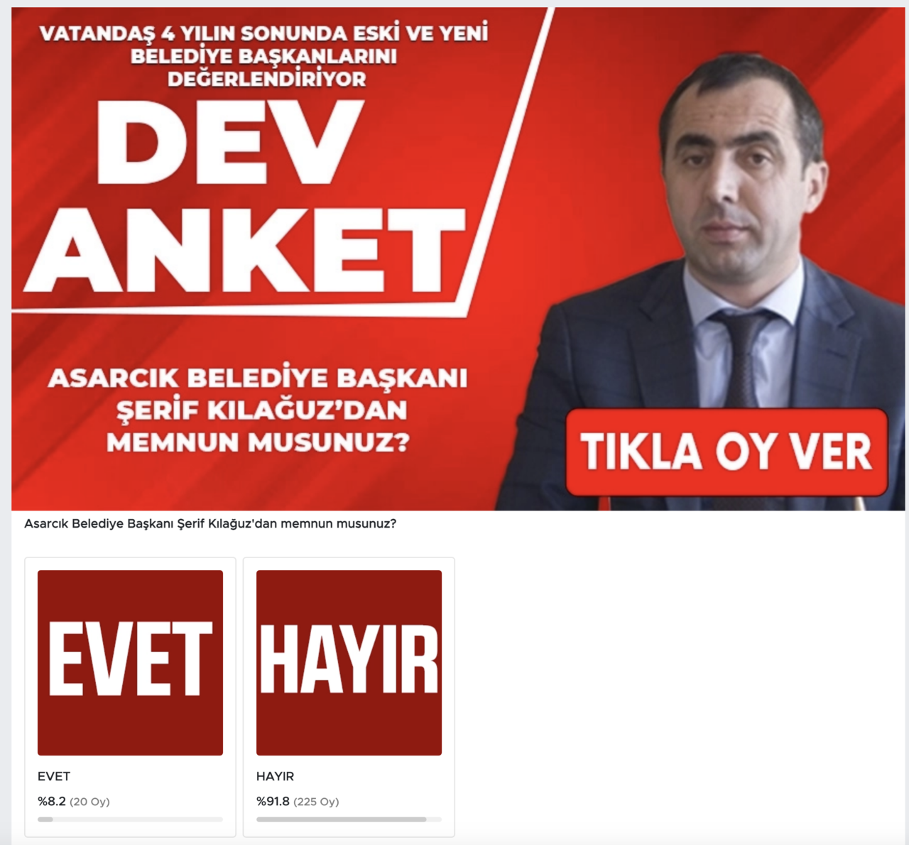 samsungazetesi.com'daki dev ankette Asarcık'ta iki dönemdir başkanlık yapan Şerif Kılağuz başarısız çıktı