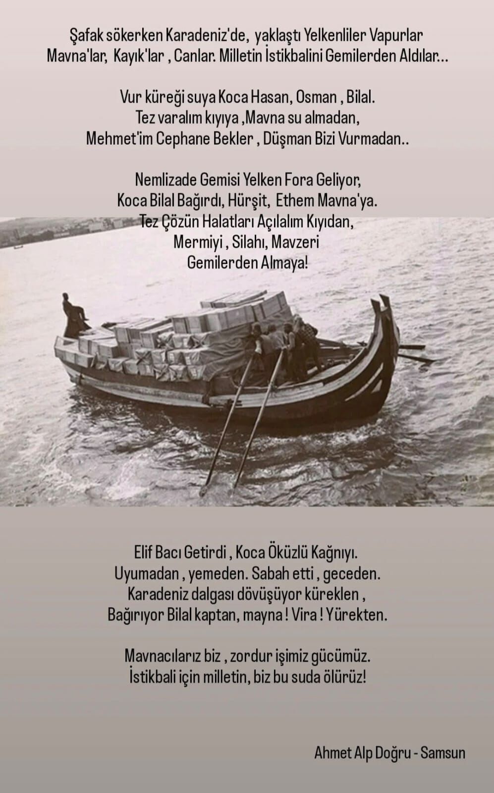 Milli Mücadele'de İstanbul'dan kaçırılan silah ve mühimmatların Anadolu'ya taşınmasında büyük emek veren Mavnacılar Loncası'nın o günkü kayıtlı üyelerinin isimlerini de vererek yazdığı şiirde şu duyguları paylaştı: