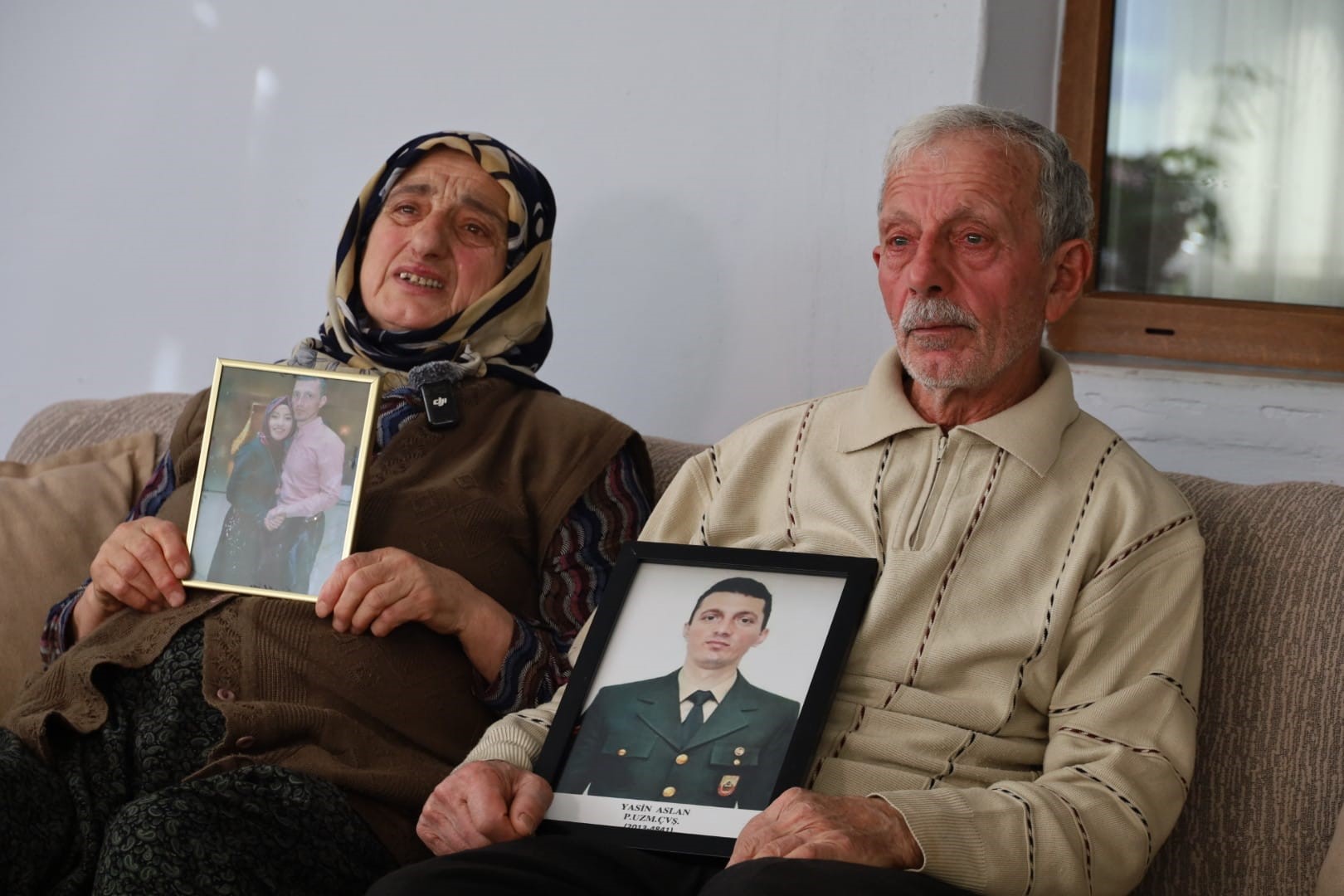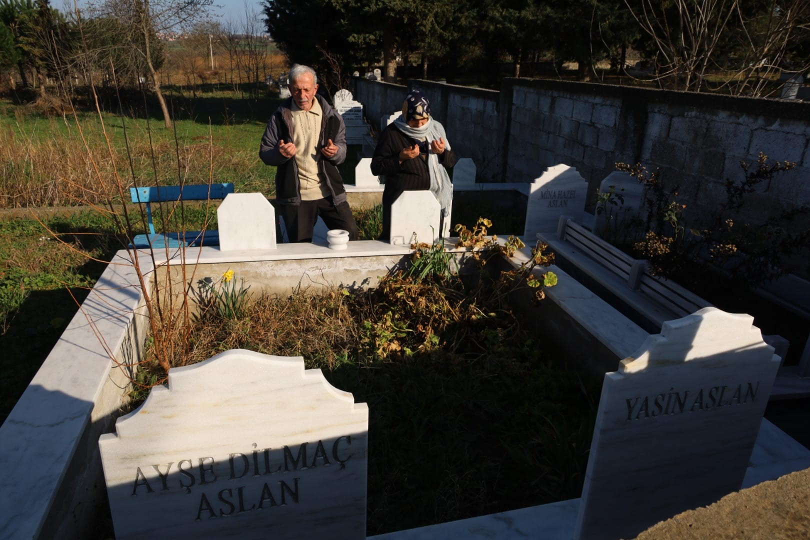 Depremde Hatay Antakya'da görev yapan oğlunu, gelinini ve torunlarını kaybeden Tenzile ve Feyzullah Aslan, depremin yıl dönümünde kaybettikleri canları mezarlıkta andı. Mezarlıkta dua ettikten sonra konuşan Tenzile Aslan, "6 Şubat depreminde oğlumu, gelinimi ve iki torunumu kaybettim. Acımız büyük acı. Vefat ettiklerinde 13 yıllık evliydiler, şimdi 16 yıl olacaktı. Depremden 1 ay önce muhabbet ederken deprem olsa nereye saklanırız diye konuşmuşlar. Yasin 'koridora sığınırız, orada hiçbir şey üzerimize düşmez' demiş. Nitekim de orada buldular evlatlarımı. Enkazda birbirlerine sarılmış vaziyetteydiler" dedi.