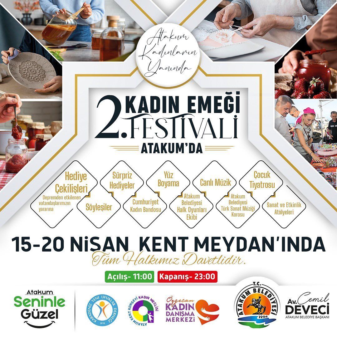 Atakum Belediyesi, Karadeniz Yeni Ufuklar Derneği, Atakum Kent Konseyi Kadın Meclisi ve Özgecan Kadın Merkezi iş birliği ile geliri depremzede vatandaşlar yararına kullanılmak üzere “2. Kadın Emeği Festivali Atakum’da” etkinliği düzenleniyor.