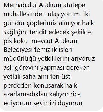 "İki gündür çöplerimiz alınmıyor. Halk sağlığını tehdit edecek şekilde pis koku mevcut. Atakum Belediyesi Temizlik İşleri Müdürlüğü yetkililerini arıyoruz, ancak asli görevini yapması gereken saha amirleri üst perdeden konuşarak halkı azarlamadıkları kalıyor. Rica ediyorum, sesimizi duyurun."
