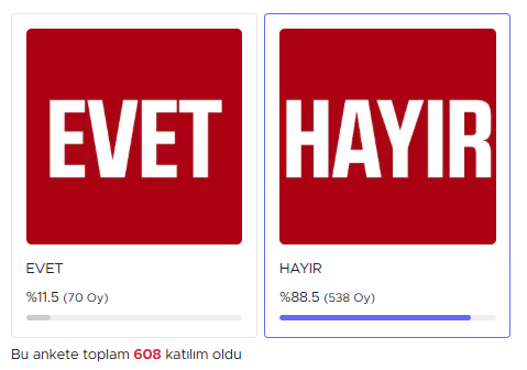 Samsungazetesi.com internet sitesinde yayınlanan ankette toplam 608 kişi oy kullandı. Katılımcıların 70'i “Evet”, 538'i ise “Hayır” oyu verdi. Sonuçlara göre açık ara farkla “Hayır” oylarının önde olduğu görüldü.