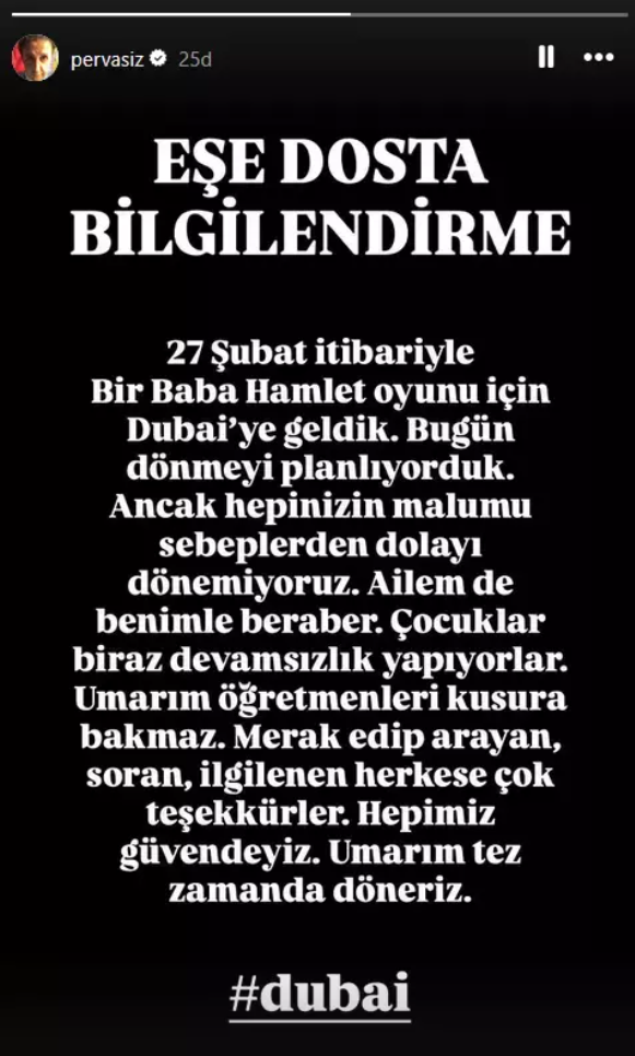 Dubai’de tiyatro oyunu için bulunan İlker Ayrık da sosyal medya hesabından yaptığı açıklamada, 27 Şubat itibarıyla “Bir Baba Hamlet” oyunu için Dubai’ye geldiklerini ve planlanan dönüşün gerçekleşmediğini belirtti.