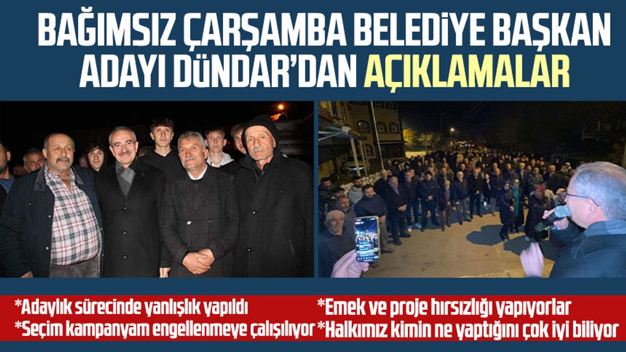'Yanlış hesap artık Bağdat'tan değil Çarşamba'dan' dönüyor diyen Dündar; " Adaylık sürecinde bir yanlışlık yapıldı. Çarşambalıların yapılan bu yanlışa vereceği cevabı tüm Türkiye öğrenecek. Yanlış hesap artık Bağdat'tan değil Çarşamba'dan dönüyor. 31 Mart sonrası Çarşamba yeniden belediyecilik çalışmaları ile yıldızını parlatacak" diyerek sözlerini tamamladı.