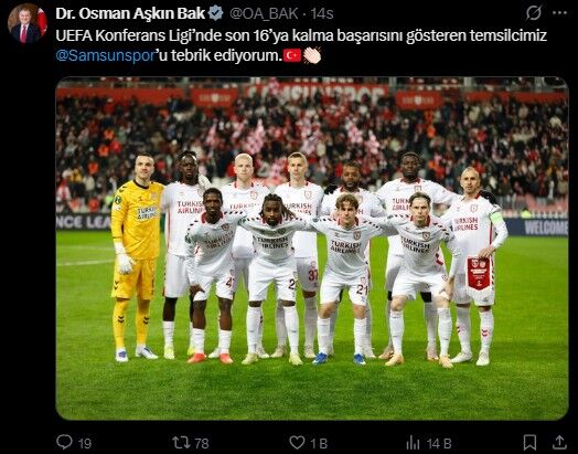 Gençlik ve Spor Bakanı Osman Aşkın Bak, sosyal medya hesabından yaptığı paylaşımda Samsunspor’u kutladı. Bakan Bak mesajında, “UEFA Konferans Ligi’nde son 16’ya kalma başarısını gösteren temsilcimiz Samsunspor’u tebrik ediyorum.” ifadelerine yer verdi.