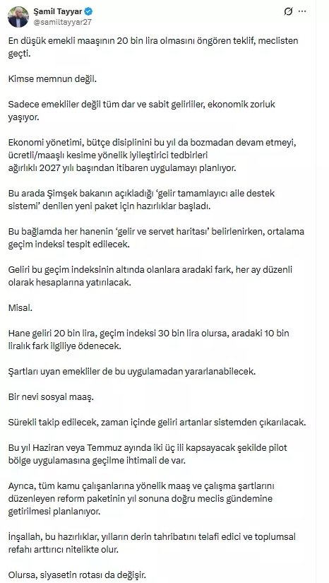 Meclis’te kabul edilen düzenleme ile en düşük emekli aylığı 20 bin TL’ye çıkarıldı ancak artan yaşam maliyetleri karşısında bu rakam emekliler ve dar gelirli kesim için yeterli bulunmadı. Eski AK Parti Milletvekili Şamil Tayyar, milyonları ilgilendiren yeni bir sosyal destek çalışmasına ilişkin dikkat çekici açıklamalarda bulundu.