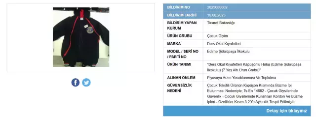 Edirne Şükrüpaşa İlkokulu'na ait okul kıyafeti, çocuk giyiminde güvenlik riski taşıdığı gerekçesiyle yasaklandı. Bakanlık, polardaki büzme ipinin boğulma tehlikesi oluşturduğunu belirterek ürünün piyasadan toplatılmasına karar verdi.