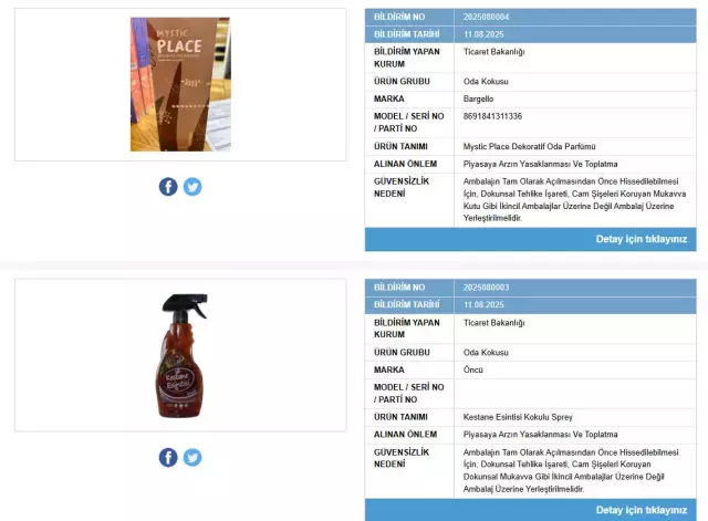 "Öncü" ve "Bargello" marka oda kokuları da yasaklanan ürünler arasında yer aldı. Bakanlık, iki ürünün de ambalaj güvenliği standartlarına uymadığını belirterek şu açıklamayı yaptı: "Ambalajın tam olarak açılmasından önce hissedilebilmesi için dokunsal tehlike işareti, cam şişeleri koruyan ikincil ambalajlar yerine doğrudan ambalaj üzerine yerleştirilmelidir."
