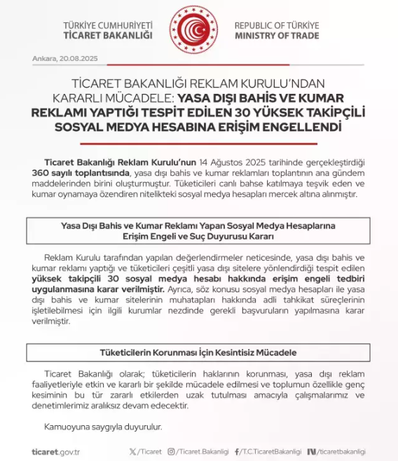 Ticaret Bakanlığı'nın duyurusu şu şekilde; "Ticaret Bakanlığı Reklam Kurulu'nun 14 Ağustos 2025 tarihinde gerçekleştirdiği 360 sayılı toplantısında, yasa dışı bahis ve kumar reklamları toplantının ana gündem maddelerinden birini oluşturmuştur. Tüketicileri canlı bahse katılmaya teşvik eden ve kumar oynamaya özendiren nitelikteki sosyal medya hesapları mercek altına alınmıştır.