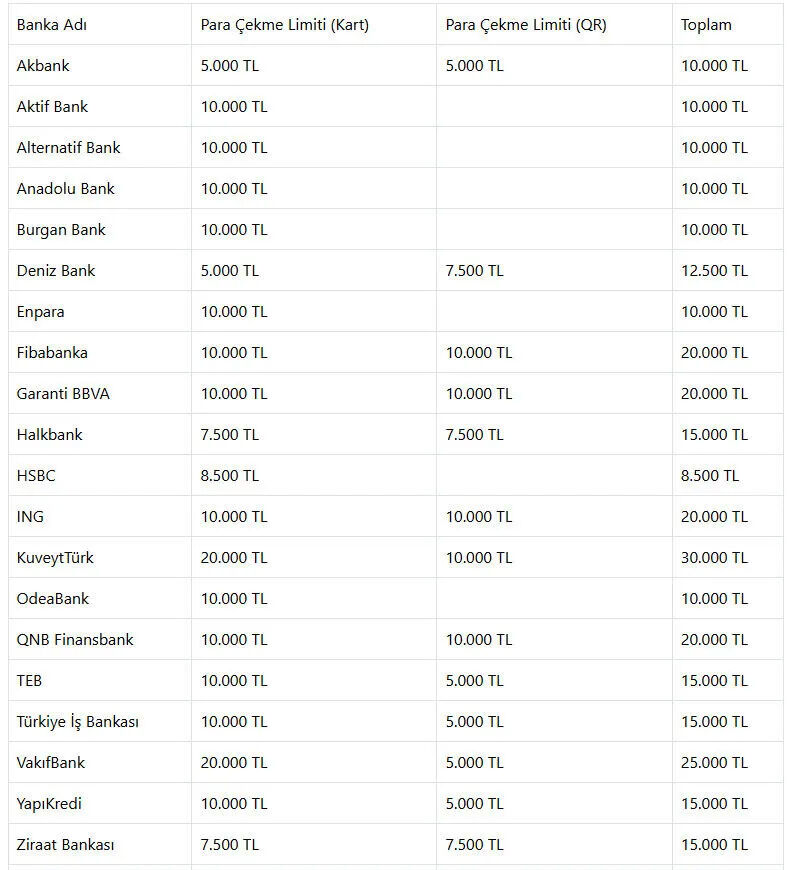 Bankaların kartlı işlemlerde değişikliğe gitmediği ve bazı özel bankaların QR kodlu para çekme işlemlerinde yükselttiği limitlerle birlikte güncel tablo şu şekilde: