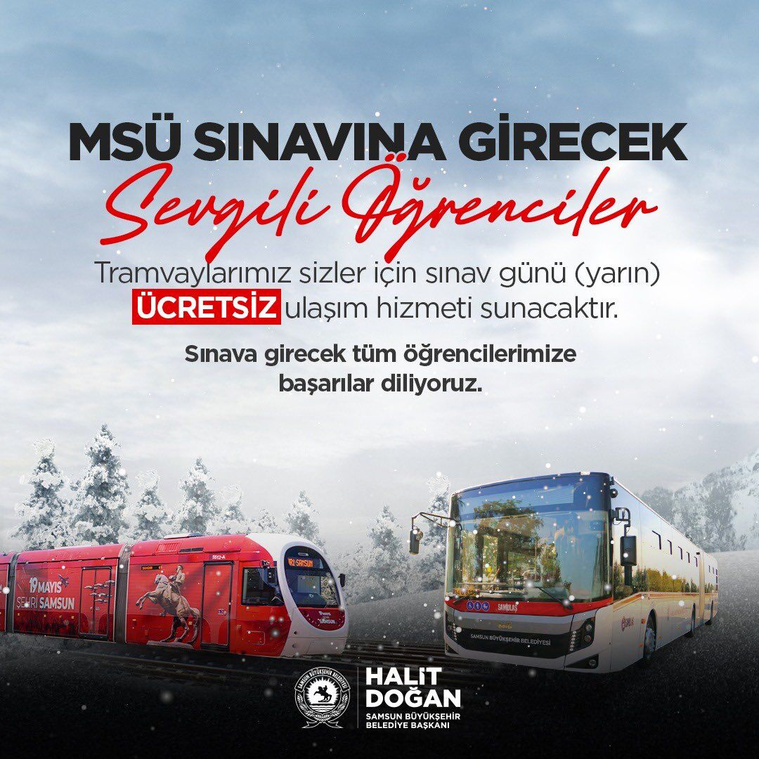 Samsun Büyükşehir Belediye Başkanı Halit Doğan, 23 Şubat Pazar günü yapılacak Milli Savunma Üniversitesi (MSÜ) sınavı için önemli bir duyuru yaptı. Başkan Doğan, sınav günü otobüs ve tramvay seferlerinin tüm adaylar için ücretsiz olacağını açıkladı. Ayrıca, sınav bölgelerine kolay erişim sağlamak amacıyla ring seferlerinin de yapılacağı belirtildi.