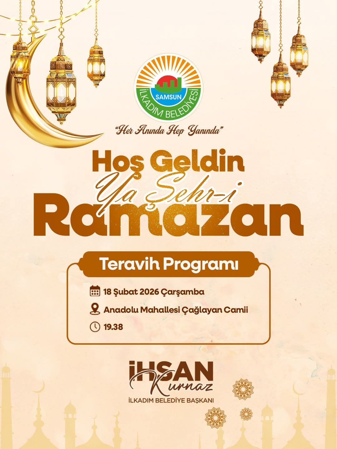 İlkadım Belediye Başkanı İhsan Kurnaz, Ramazan ayının ilk teravih namazı için vatandaşları Anadolu Mahallesi Çağlayan Camii’ne davet etti.