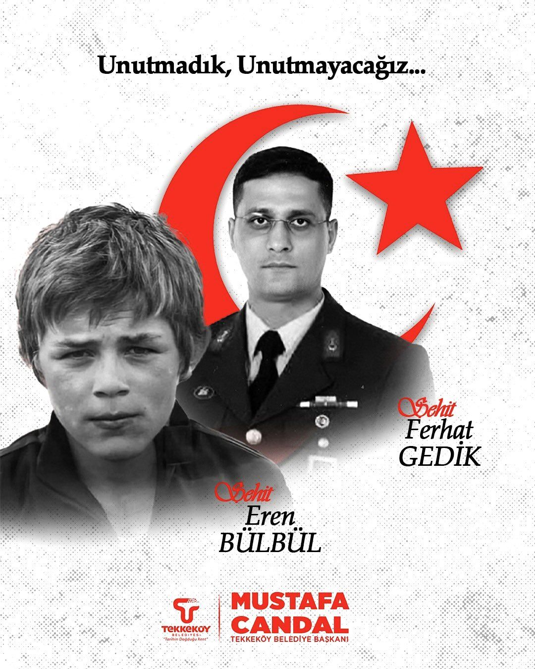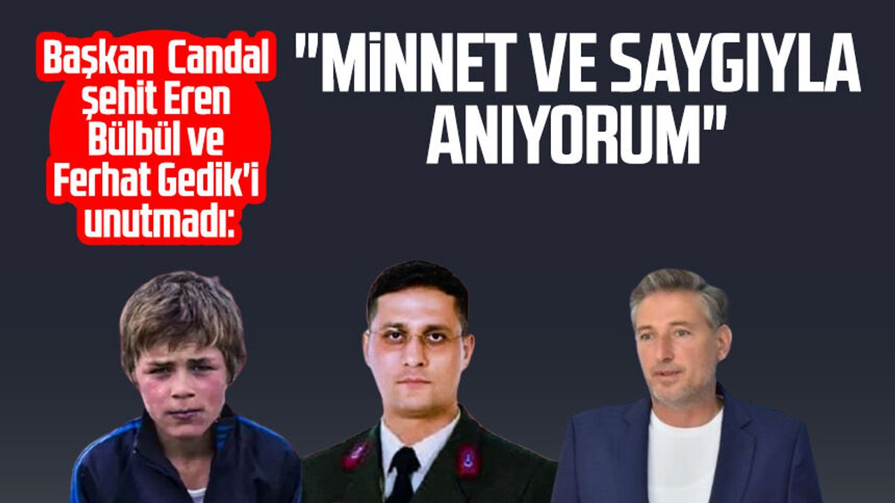 Başkan Candal, sosyal medya hesabından yaptığı paylaşımda, “İyi ki varsınız… Henüz 15 yaşında, tertemiz yüreğiyle vatan için canını feda eden Eren Bülbül’ü ve onu korumaya çalışırken 41 kurşunla kahramanca şehit olan Astsubay Ferhat Gedik’i vefatlarının 8. yıl dönümünde rahmet, minnet ve saygıyla anıyorum. Cesaretleri ve fedakârlıkları milletimizin kalbinde ebediyen yaşayacak. Ruhları şad, mekânları cennet olsun” ifadelerini kullandı.
