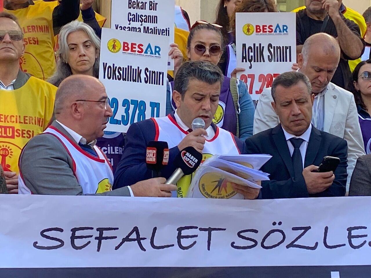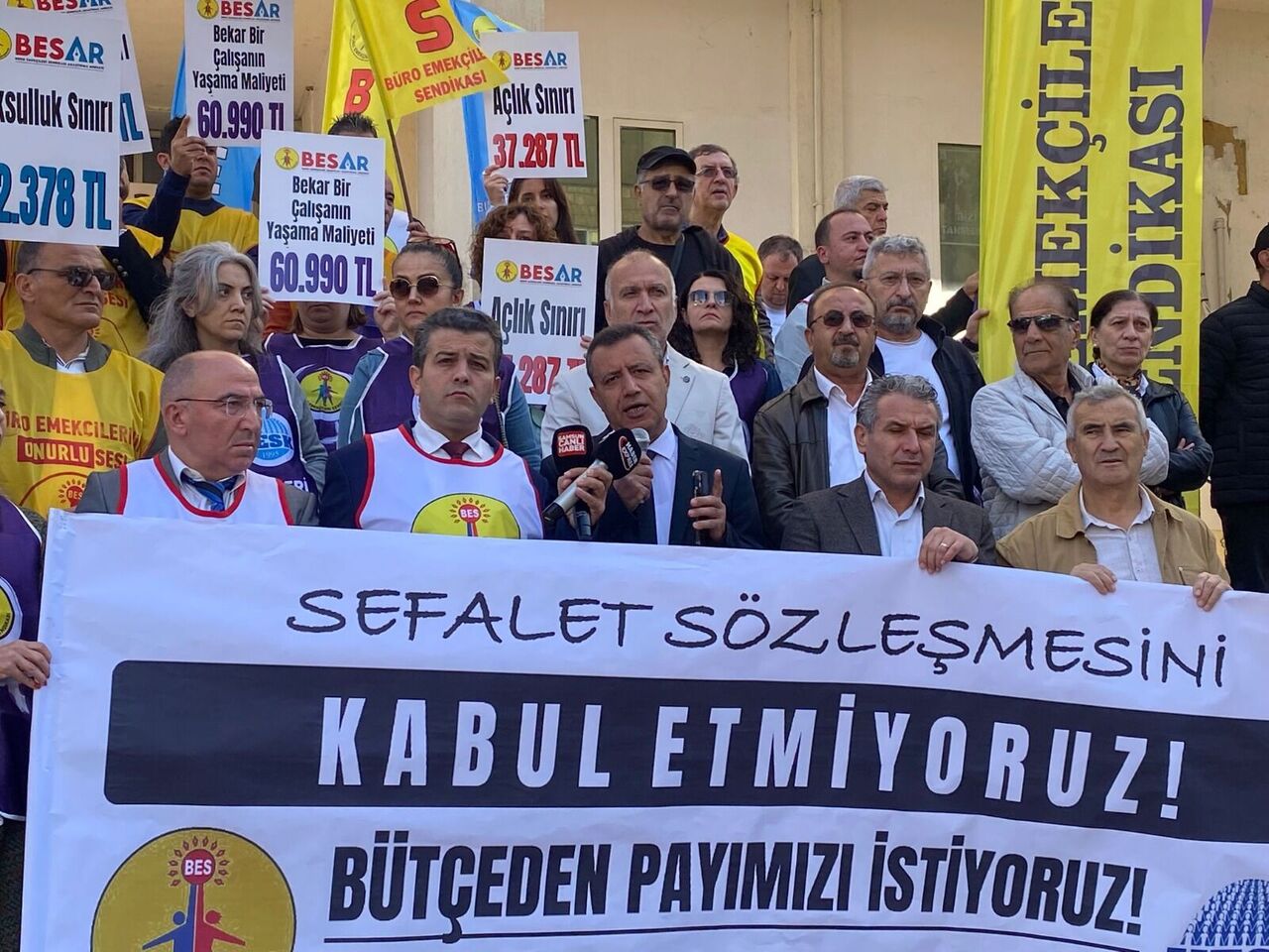 Büro Emekçileri Sendikası Genel Başkanı Özer Avanaş, "Bizler çok başlıklı sorunlarla mücadele etmeye devam ediyoruz. Biz 8 TİS'te hep kaybeden taraf olduk. 4 kişilik bir ailenin açlık sınırı 37 bin 287 lira olmuştur. Tek bir bekar çalışanın yaşama maliyeti 61 bin liraya ulaşmıştır. Yoksulluk sınırı 90 bin 378 lirayı geçmiştir. Ortalama bir kamu çalışanı 57 bin lira maaş alıyor. Yoksulluk sınırının altında, açlık sınırının biraz üzerindeki bir ücretle yaşama tutunmaya çalışıyoruz. Bizler bu sefaleti kabul etmiyoruz.Bu ülkede yoksulluk derinleşiyor. Bizler önümüzdeki süreçte Bütçeyle birlikte 2026'yı mücadele yılı ilan ediyoruz. Sadece bizler değil, bu ülkenin yoksulları, esnafı, çiftçisi, vergiyle bunaltılan üreticisi, herkesle birlikte bir mücadele vereceğiz. Bunun başka yolu yok" dedi.