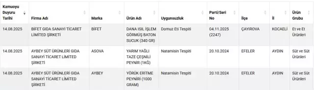 Bakanlık denetimleri sonucunda Bifet Gıda Sanayi Ticaret Limited Şirketi'ne ait 'Bifet' markalı dana sucukta domuz eti tespit edildi. Şirketin, 31 Temmuz'da yayımlanan önceki listede de aynı gerekçeyle yer aldığı belirlendi.