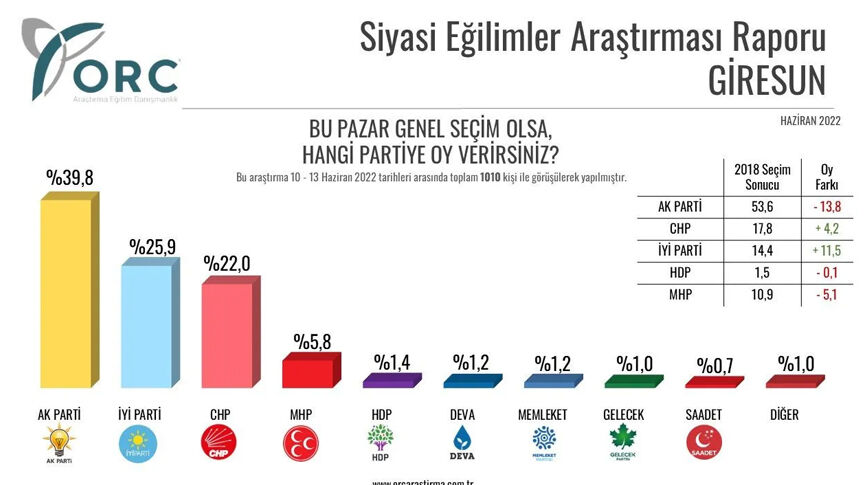 ORC Araştırma, 3 Karadeniz kentinde yaptığı siyasi eğilimler araştırmasının raporunu yayınladı. Samsun, Karabük ve Giresun'da 11-14 Haziran arasında yapılan araştırmada Samsun'da 1670, Karabük'te 935, Giresun'da 1010 kişiyle konuşuldu. Katılımcılara "Bu pazar seçim olsa, hangi partiye oy verirsiniz?" sorusu soruldu.