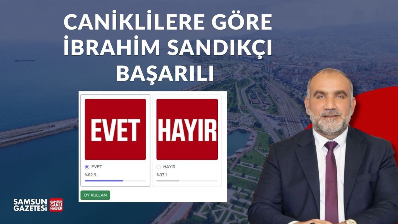 Samsun Medya Grubu, sosyal medya hesapları ve internet haber sitesi üzerinden, Canik Belediye Başkanı İbrahim Sandıkçı'nın görev performansına ilişkin anket düzenledi. Yerel yönetimlerin 2024-2029 döneminin ikinci yılında gerçekleştirilen ankete vatandaşlar yoğun ilgi gösterdi. Katılımcıların yüzde 62.9'u “Evet”, yüzde 37.1'i ise “Hayır” oyu verdi.
