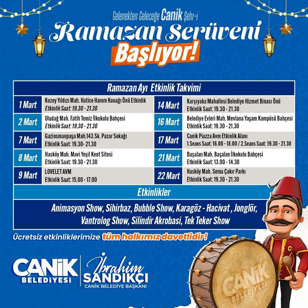 Canik Belediyesi'nin Kültür ve Turizm Bakanlığı'nın katkılarıyla ilçede gerçekleştireceği ve çeşitli ikramların da yer alacağı Canik Şehr-i Ramazan Serüveni etkinlik takvimi, Canik Belediye Başkanı İbrahim Sandıkçı ve Canik Belediyesi sosyal medya hesaplarında yer alıyor.