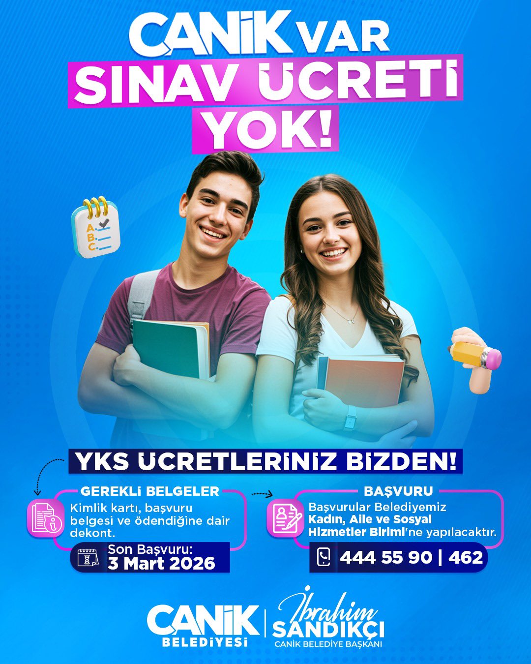 - Samsun Canik, 12 Şubat: YKS ücretleri belediyeden karşılanacak.