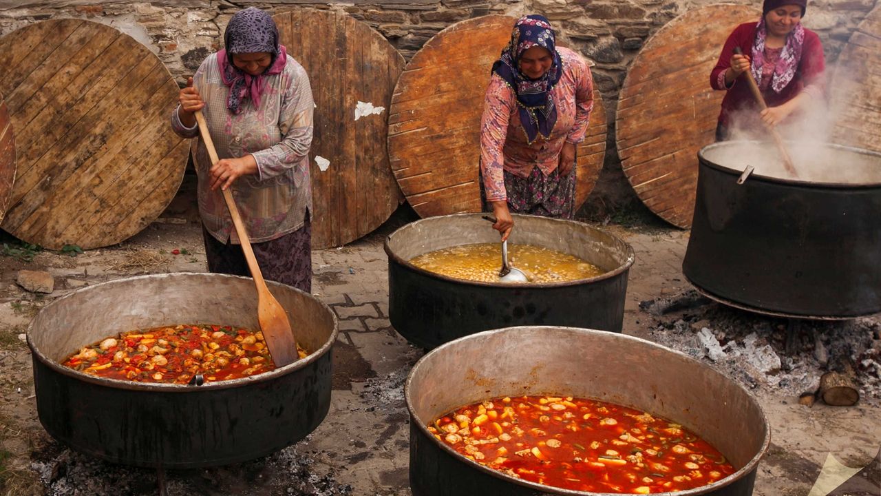 hazırlıklar imece usulü yapılır; komşular ve aile bireyleri birlikte çalışarak yemekleri hazırlar.