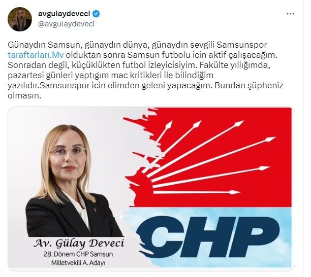 CHP Samsun Milletvekili Aday Adayı Av. Gülay Deveci, vekil olarak seçilmesi taktirinde, Samsunspor için elinden geleni yapacağını belirterek, "Günaydın Samsun, günaydın dünya, günaydın sevgili Samsunspor taraftarları. Milletvekili olduktan sonra Samsun futbolu için aktif çalışacağım. Sonradan değil, küçüklükten futbol izleyicisiyim. Fakülte yıllığımda, pazartesi günleri yaptığım maç kritikleri ile bilindiğim yazılıdır. Samsunspor için elimden geleni yapacağım. Bundan şüpheniz olmasın" dedi.