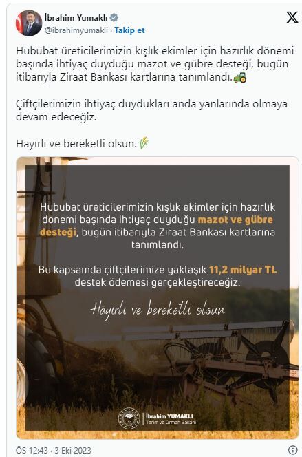 "Hububat üreticilerimizin kışlık ekimler için hazırlık dönemi başında ihtiyaç duyduğu mazot ve gübre desteği, bugün itibarıyla Ziraat Bankası kartlarına tanımlandı. Çiftçilerimizin ihtiyaç duydukları anda yanlarında olmaya devam edeceğiz. Hayırlı ve bereketli olsun."