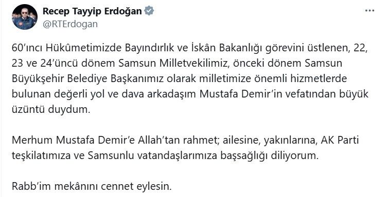 "60’ıncı Hükûmetimizde Bayındırlık ve İskân Bakanlığı görevini üstlenen, 22, 23 ve 24’üncü dönem Samsun Milletvekilimiz, önceki dönem Samsun Büyükşehir Belediye Başkanımız olarak milletimize önemli hizmetlerde bulunan değerli yol ve dava arkadaşım Mustafa Demir’in vefatından büyük üzüntü duydum.