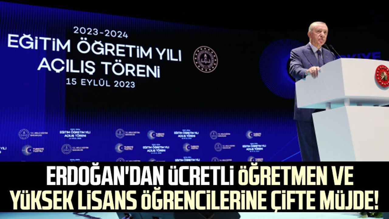 Cumhurbaşkanı Recep Tayyip Erdoğan, Atatürk Kültür Merkezi'nde gerçekleştirilen 2023-2024 Eğitim Öğretim Yılı Açılış Töreni'ne katıldı. Burada açıklamalarda bulunan Cumhurbaşkanı Erdoğan, ücretli öğretmen ve yüksek lisans öğrencilerine birer müjde verdi. Erdoğan, ücretli öğretmenlerin ek ders ücretleriyle yüksek lisans öğrencilerinin burslarının artırılacağını söyledi.