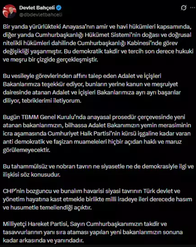 Bahçeli, kabinede yapılan görev değişikliğinin Anayasa ve Cumhurbaşkanlığı Hükümet Sistemi çerçevesinde hukuki ve meşru olduğunu belirterek, görevlerinden ayrılan eski bakanlara teşekkür etti, yeni atanan bakanlara ise başarı dileklerini iletti.