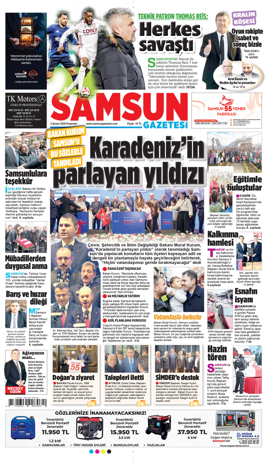 2 Şubat Pazartesi Samsun Gazetesi