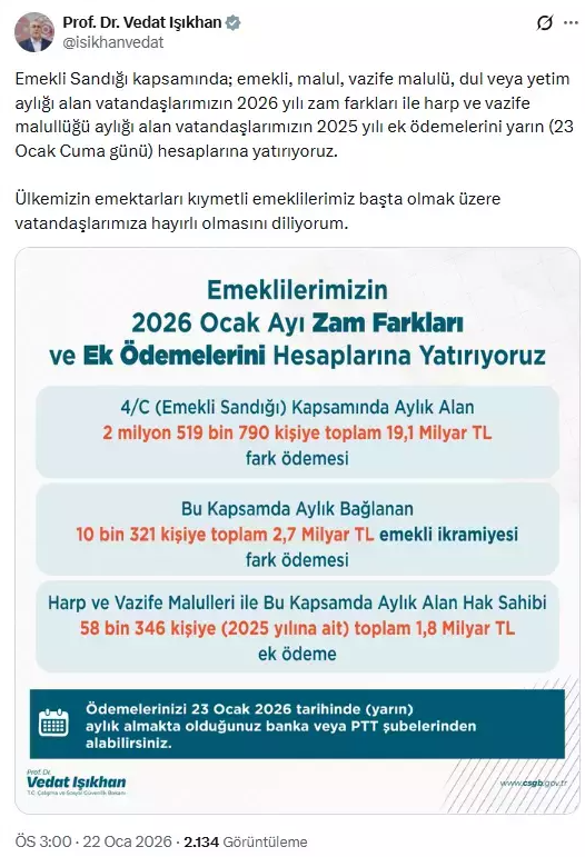 Bakan Işıkhan, sosyal medya hesabından yaptığı açıklamada şu ifadelere yer verdi: “Emekli Sandığı kapsamında emekli, malul, vazife malulü, dul ve yetim aylığı alan vatandaşlarımızın 2026 yılı zam farklarını, ayrıca harp ve vazife malullüğü aylığı alanların 2025 yılı ek ödemelerini yarın hesaplara yatırıyoruz. Tüm emeklilerimize hayırlı olmasını diliyorum.”