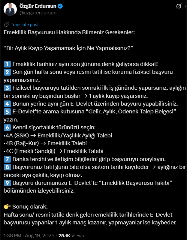 Erdursun’un açıklamasına göre emeklilik tarihi ayın son gününe denk geliyorsa vatandaşların büyük risk altında olduğunu vurguladı. Son günün hafta sonuna veya resmi tatile denk gelmesi halinde kuruma fiziki başvuru yapılamıyor.