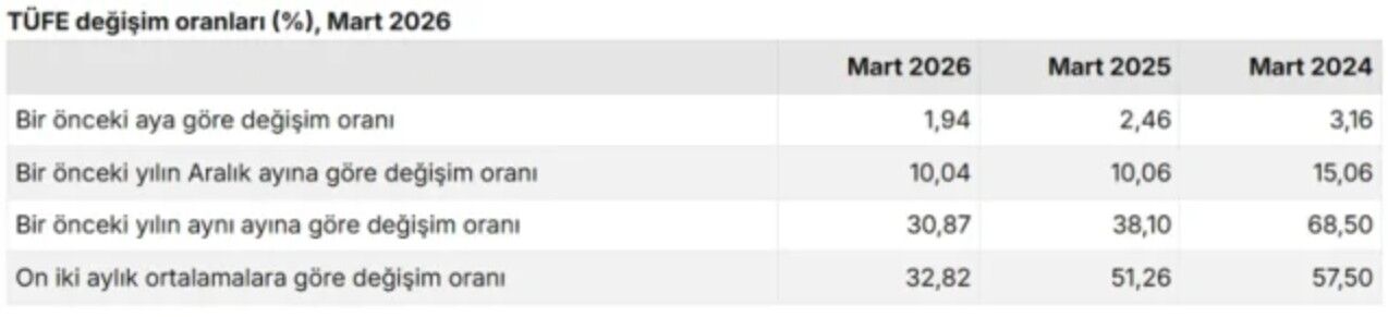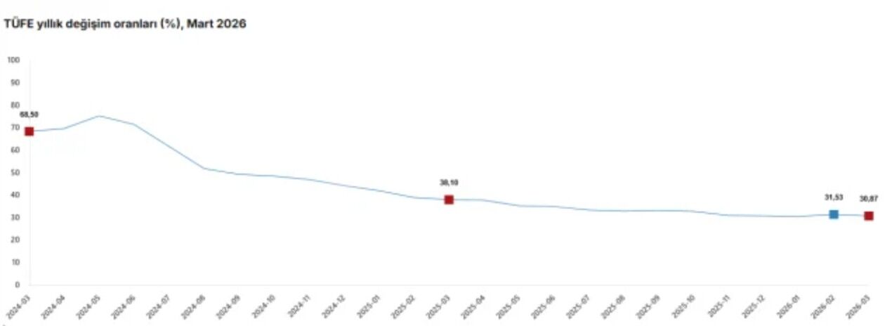 Türkiye İstatistik Kurumu (TÜİK), mart ayına ilişkin enflasyon verilerini duyurdu. Buna göre mart ayında tüketici fiyatları aylık yüzde 1,94 artarken, yıllık enflasyon yüzde 30,87 olarak kaydedildi. On iki aylık ortalamalara göre artış ise yüzde 32,82 oldu.