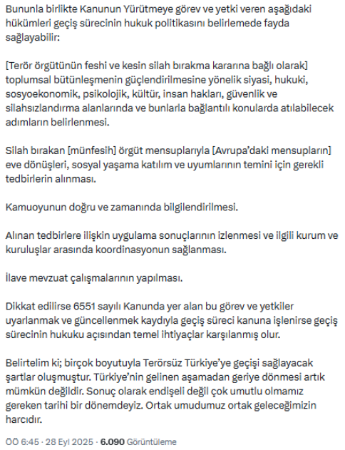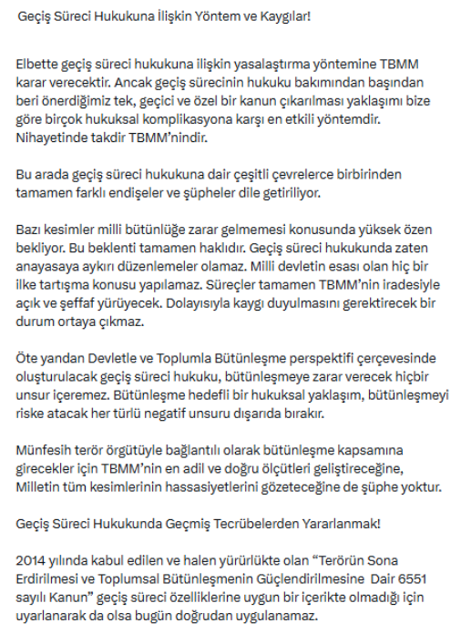“Geçiş süreci hukukuna ilişkin yasalaştırma yöntemine elbette TBMM karar verecektir. Ancak bizim başından beri önerdiğimiz yaklaşım; tek, geçici ve özel bir kanun çıkarılmasıdır. Bu yöntem, doğabilecek hukuki komplikasyonları önleme açısından en etkili yoldur.”