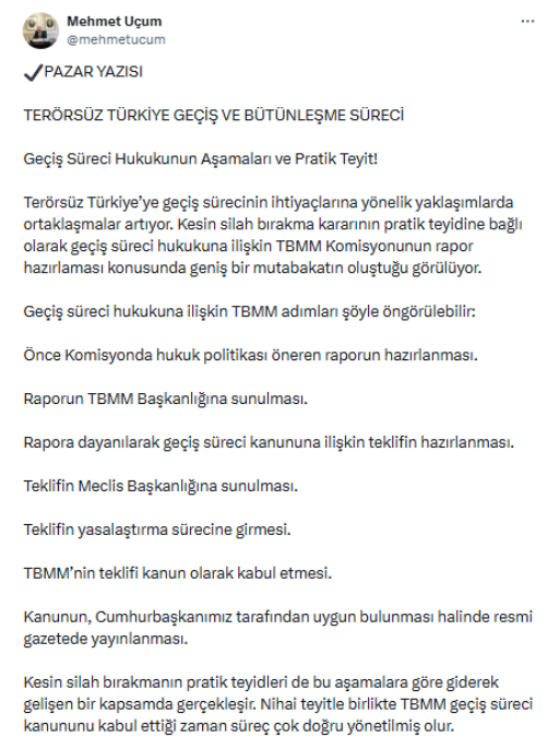 Uçum yazısında, geçiş sürecinin yasal çerçevesinin nasıl oluşturulması gerektiğine ilişkin önerisini de paylaştı. Bu sürecin, TBMM'nin kararıyla işleyeceğini vurgulayan Uçum, şu değerlendirmelerde bulundu: