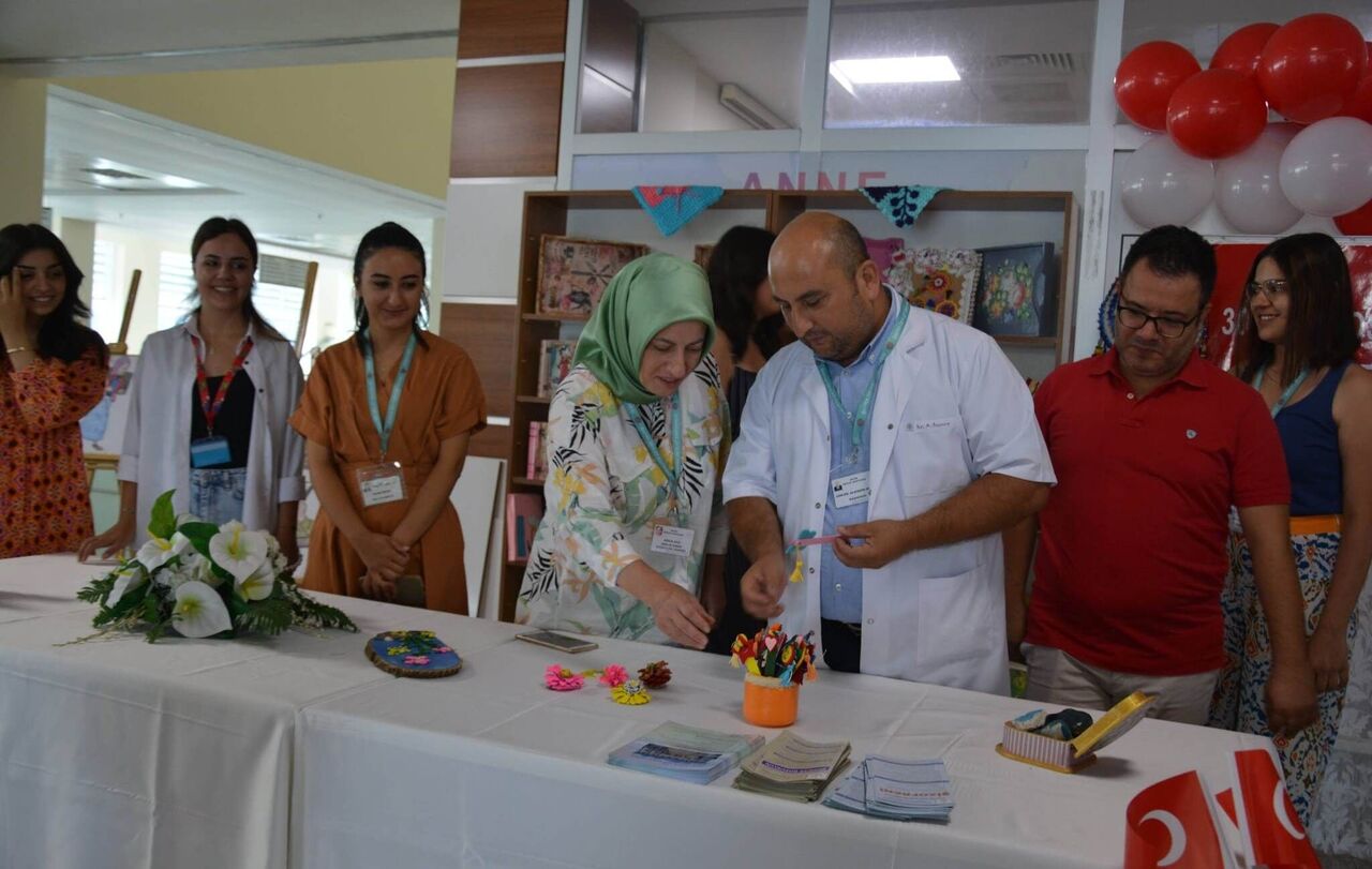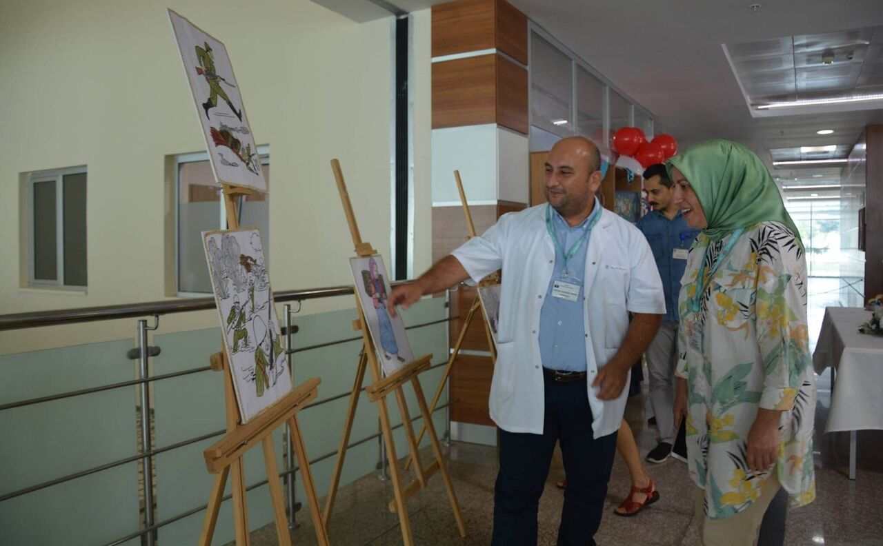 Poliklinikler girişinde açılan sergiyi gezen Başhekim Uzm. Dr. Alaiddin Domaç, Başhekim Yardımcısı Uzm. Dr. Emre Kıraç, Sağlık Bakım Hizmetleri Müdürü Emine Avcı, Müdür Yardımcısı Özcan Şenyurt ve hasta yakınları yapılan resim ve el işlerini incelediler.