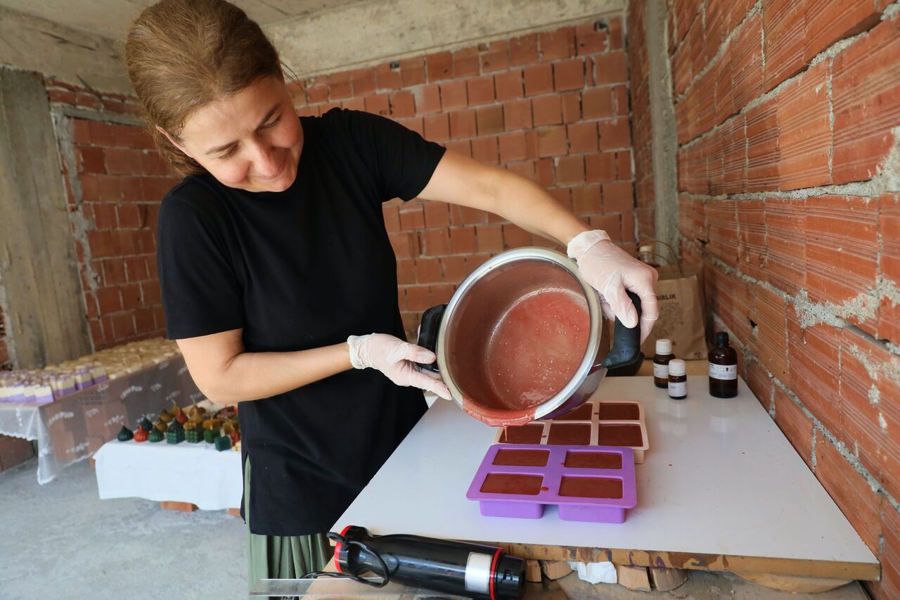 Samsun'un sahil ilçesi Alaçam'da yaşayan Bahar ve Gürhan Batı çifti, evlerinin terasında hamsi yağından renkli sabunlar üretiyor.