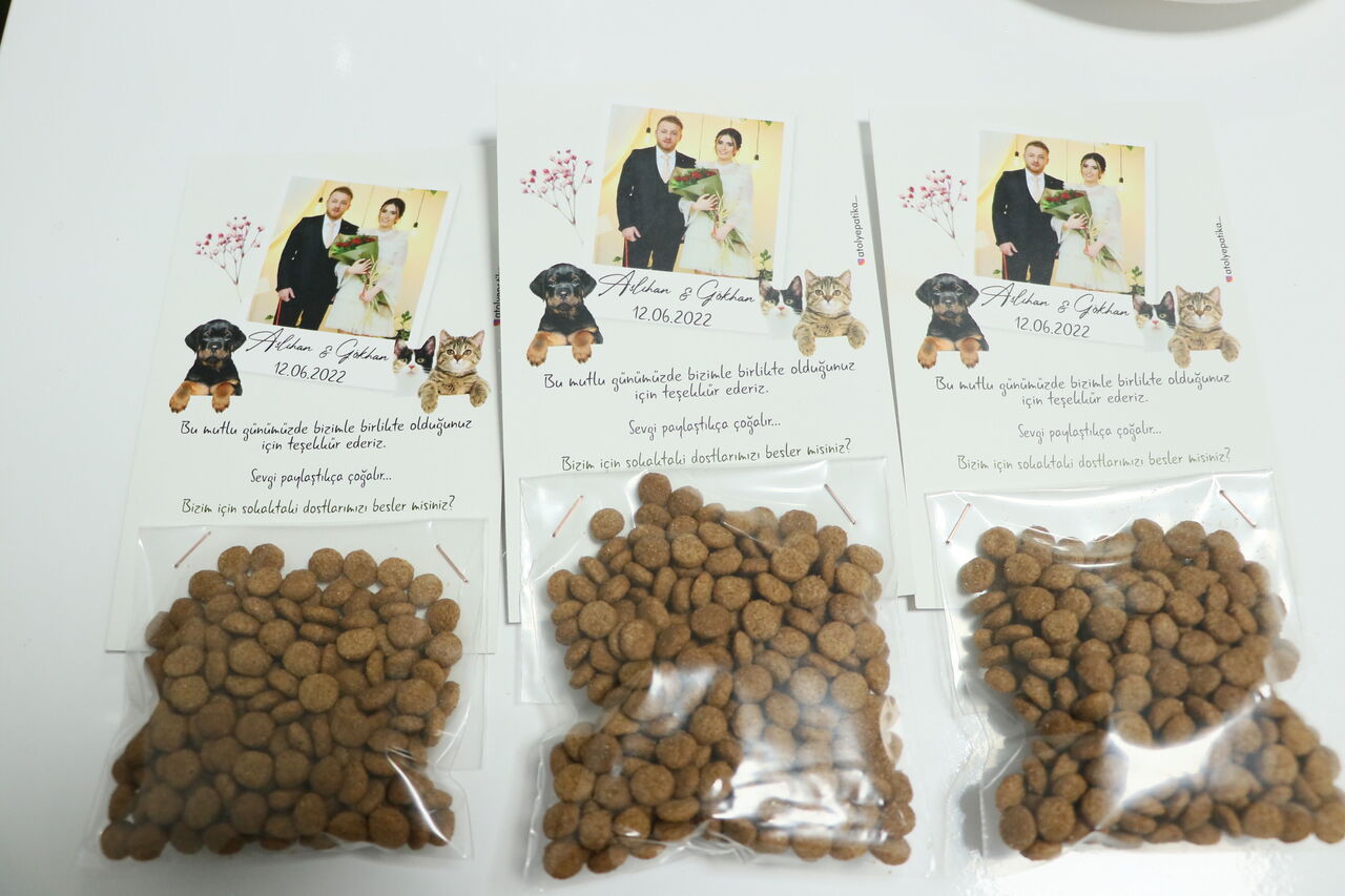 Çift, düğünlerinde davetlilere nikah şekeri yerine, üzerinde kendi fotoğrafları ile sevimli kedi ve köpek fotoğraflarının yer aldığı, "Bu mutlu günümüzde bizimle birlikte olduğunuz için teşekkür ederiz. Sevgi paylaştıkça çoğalır. Bizim için sokaktaki dostlarımızı besler misiniz?" yazan kartlarla 200 mama paketinde yaklaşık 20 kilogram mama dağıttı.